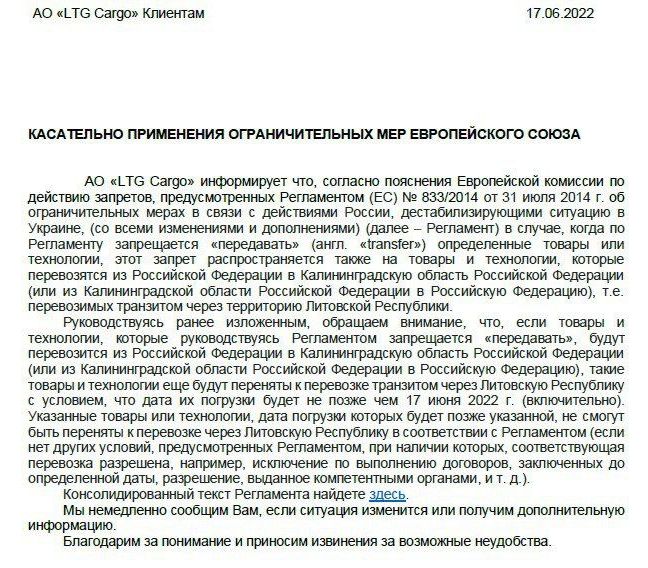 Глава региона А. Алиханов опубликовал документ от АО «LTG Cargo», что на Калининградскую область больше не распространяется исключение по перевозке грузов, которое ранее было сделано в одном из очередных пакетов западных санкций в отношении России.