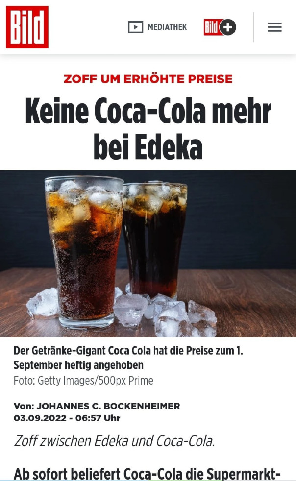 Как сообщает ТАСС, немецкая сеть супермаркетов Edeka убрала со своих прилавков Coca-Cola после резкого подорожания этого напитка, которое объявлено производителем с 1 сентября.