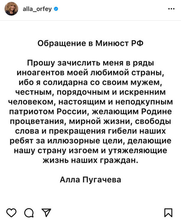 Певица опубликовала обращение к Минюсту в социальной сети Instagram (запрещена в России). Она сообщила, что солидарна с мужем, который желает родине процветания и мирной жизни. Пугачева назвала Галкина настоящим и неподкупным патриотом.