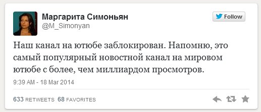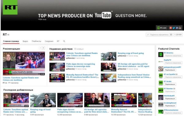 YouTube-канал RT на английском языке, занимающий первое место среди мировых новостных телеканалов на видеосервисе, был заблокирован утром 18 марта. Видеосюжеты RT были недоступны в течение нескольких часов. При попытке открыть страницу канала RT на YouTube появлялось сообщение о том, что работа аккаунта «приостановлена из-за многочисленных и серьезных нарушений политики YouTube». Американская корпорация Google, которой принадлежит YouTube, «разбирается в ситуации» с каналом RT, цитирует представителя компании Светлану Анурову ИТАР-ТАСС. Впрочем, причину блокировки она не назвала. Подобная блокировка аккаунта RT на YouTube уже происходила два года назад. 18 марта 2012 года аккаунт RT на YouTube был заблокирован в течение семи часов. По словам представителей Google, это была техническая ошибка.
