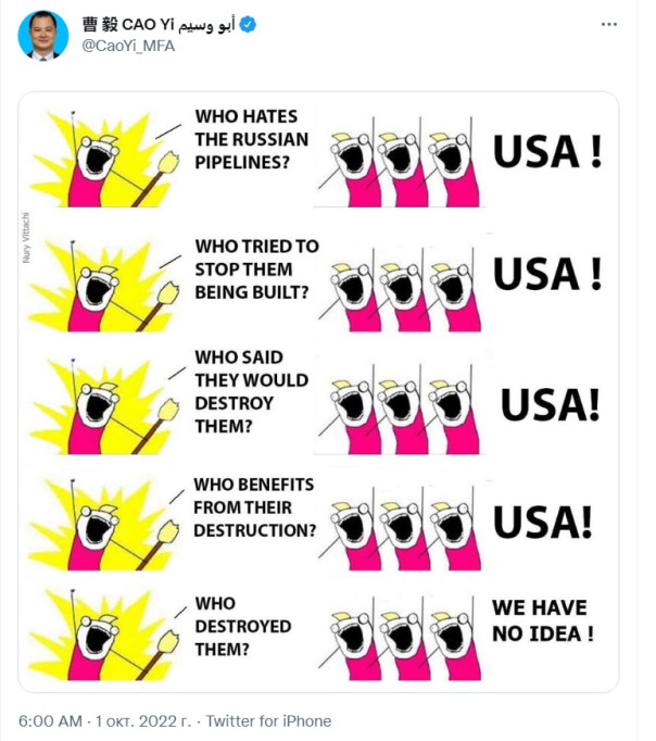 На своей странице в Twitter (соцсеть заблокирована в РФ) дипломат опубликовал мем, задав вопросы о том, кому выгодно ЧП на газопроводах.