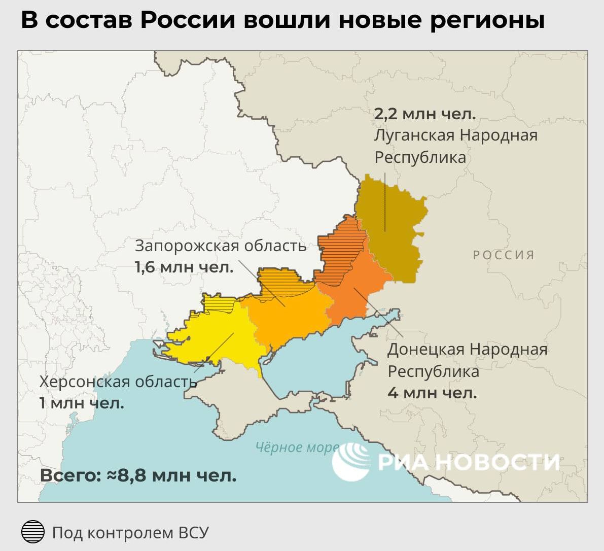 В состав России вошли ЛНР, ДНР, Запорожская и Херсонская области.