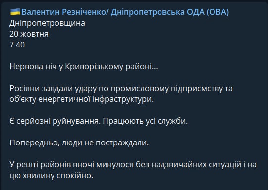 Резниченко написал в своем Telegram-канале, что в Криворожском районе Днепропетровской области разрушен объект энергетической инфраструктуры, также удар был нанесен по одному из предприятий. По его словам, люди не пострадали, передает РИА «Новости».