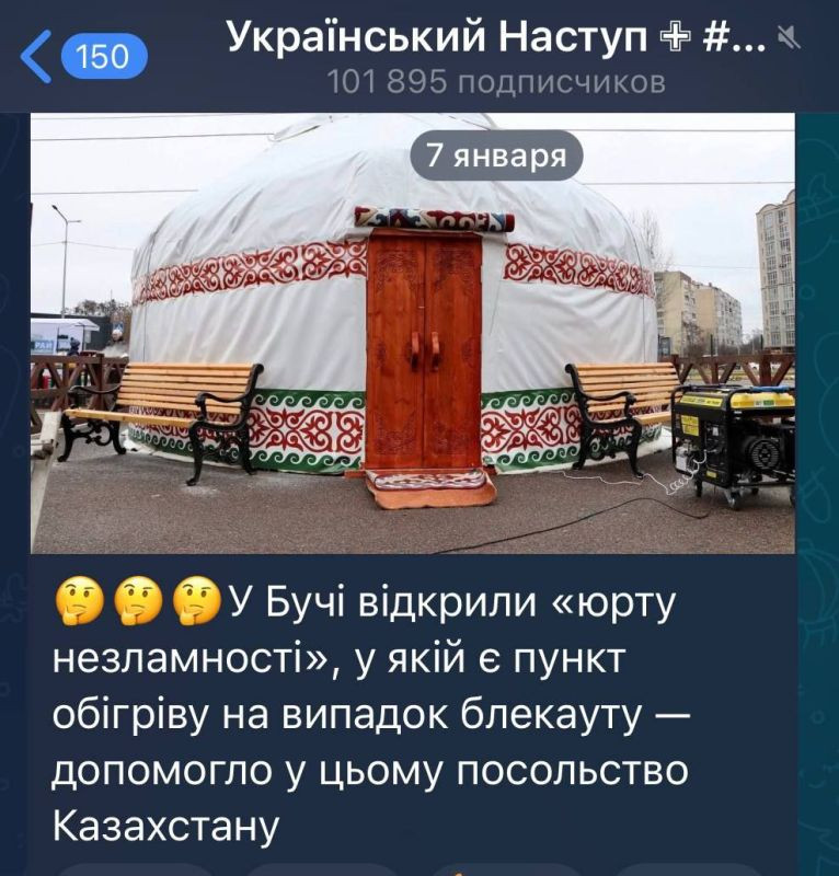 На сайте городского совета Бучи опубликовано сообщение о том, что "благодаря поддержке посольства республики Казахстан в Украине и народного депутата Украины, председателя депутатской группы межпарламентских связей с республикой Казахстан Сергея Нагорняка" появилась юрта несокрушимости. Как сообщил 10 января МИД РФ, казахстанская сторона заверила российскую, что тиражируемая в СМИ информация об акции в украинской Буче при участии МИД Казахстана не соответствует действительности.