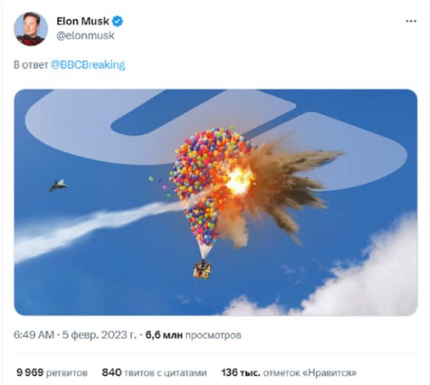Комментируя публикации об этом в СМИ, предприниматель разместил в своем твиттере картинку-мем по мотивам мультфильма "Вверх" (Up, 2009). На изображении американские истребители бомбят разноцветные надувные шары, с помощью которых перемещался дом главного героя. Пост Маска лайкнули более 100 тысяч раз за четыре часа с момента публикации.
