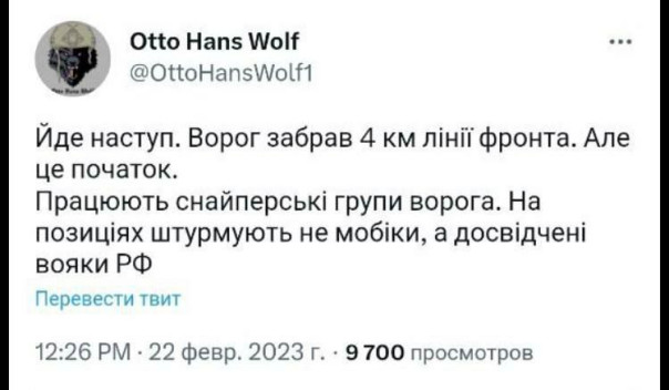 «Идёт наступление, противник забрал 4 километра линии фронта. Это только начало. Работают снайперские группы врага, штурмуют не мобики, а опытные российские военные»,