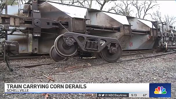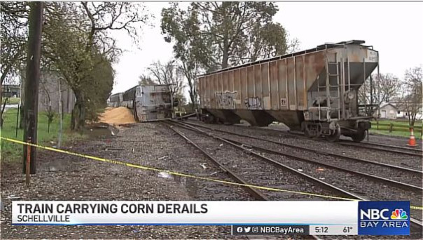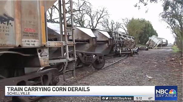 Поезд, гружёный кукурузным зерном, сошел с рельсов в округе Сонома в Калифорнии