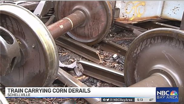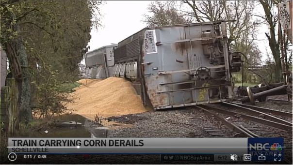 По данным пожарной охраны района Шелл-Вист, медленно движущийся поезд с кукурузным зерном вдруг опрокинулся, рассыпав повсюду кукурузу.