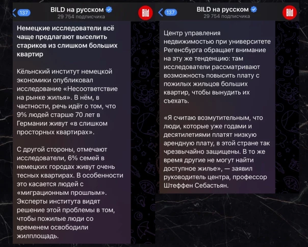 Не поверил бы, если бы не прочитал своими глазами. Честно. Справедливо заблокированное в России издание «BILD» с удовольствием сообщает: немецкие пенсионеры занимают «слишком большую» жилплощадь, а потому «их нужно подвинуть» в пользу мигрантов и их потомков.