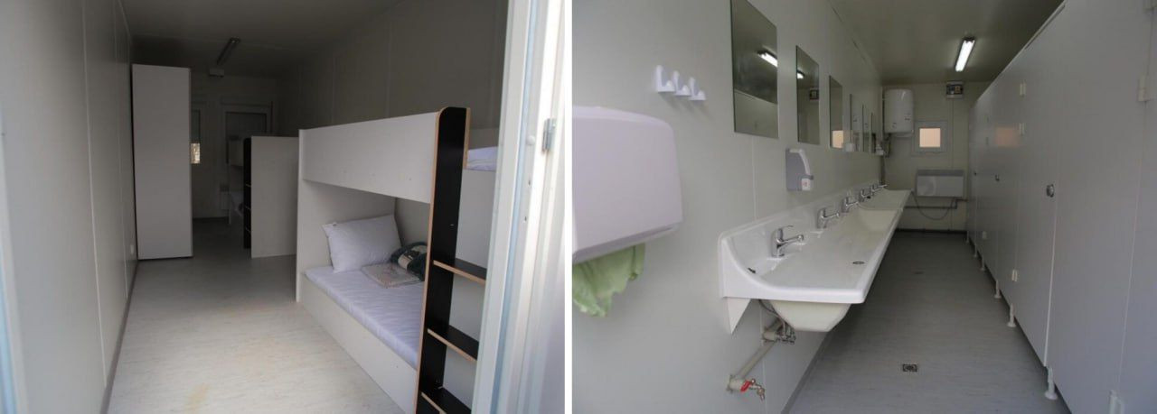Это, скорее всего, контейнерные общежития, с общими туалетами и кухонными блоками. Условия спартанские, но после года проживания в школьном кабинете люди, не имеющие средств для аренды квартир, рады и таким новым условиям.