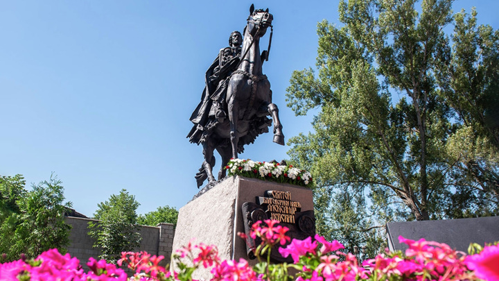 13 июля в Алма-Ате на площади перед собором был открыт памятник Александру Невскому. Монумент представляет собой фигуру князя верхом на коне с чудотворной Феодоровской иконой Царицы Небесной в руках.