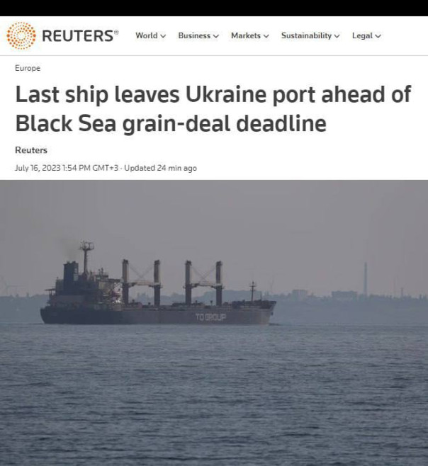 Последний корабль с сельскохозяйственной продукцией по злополучной зерновой сделке вышел из одесской гавани. Крайнее зерновое судно было зарегистрировано 27 июня, после этого регистрация встала. А президент России Владимир Путин заявил 13 июля, что Россия приостановит участие, если наши условия не будут выполнены.