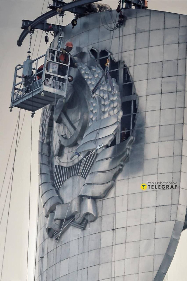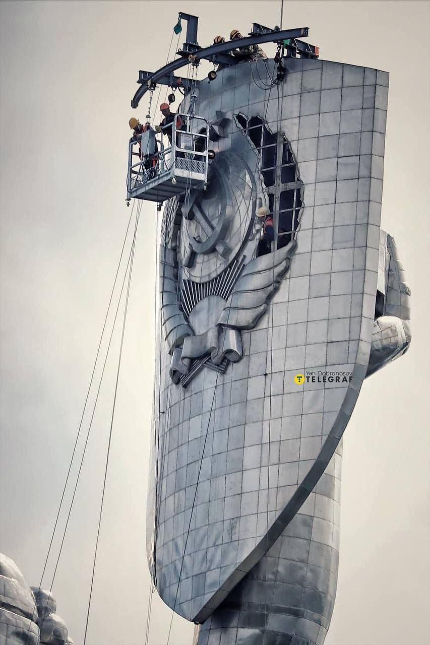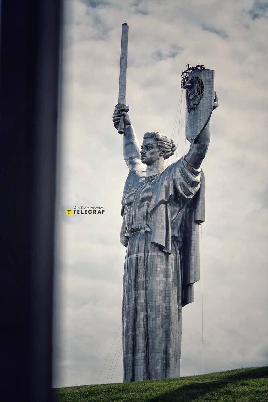 Киевские твари похвастались фотографиями демонтажа советского герба на Родине-Матери, вместо которого на щит прикрепят трезуб.