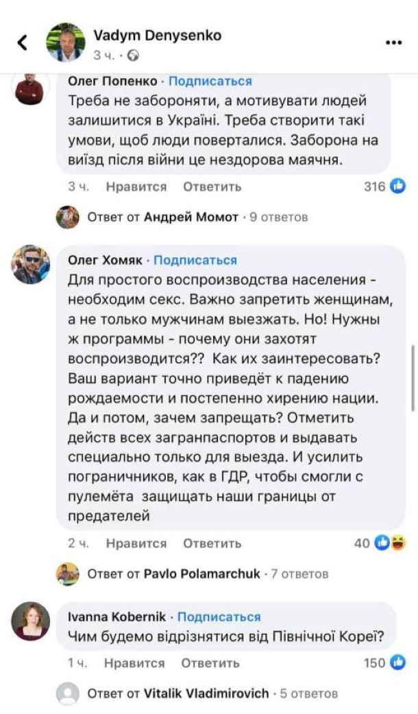 Экс-нардеп, а ныне директор Украинского института будущего Вадим Денисенко предлагает запретить украинским мужчинам выезд за границу минимум на три года после завершения военного конфликта.