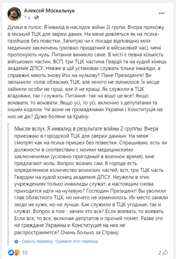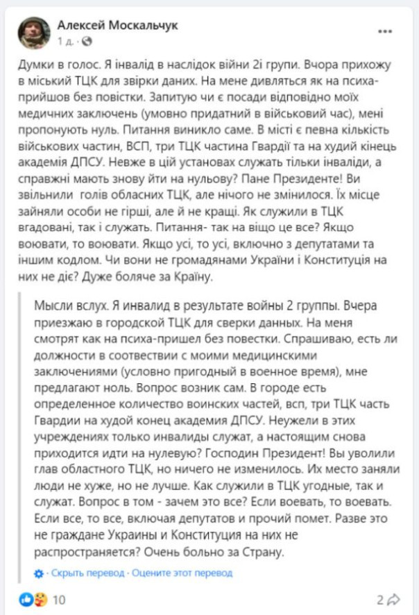 «На меня посмотрели, как на психа — пришел без повестки. Спрашиваю есть ли должности в соответствии с моим медицинским заключением (условно пригодный в военное время), мне предлагают ноль. В городе есть определённое количество военных частей, три ТЦК, часть Нацгвардии и на худой конец академия Госпогранслужбы. Неужели в этих учреждениях служат только инвалиды, а настоящим снова придодится идти на нулевую», — возмущается экс-АТОшник.