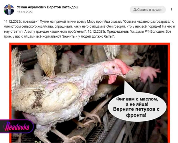 Руководитель межрегионального узбекского землячества «Ватандош» Усман Баратов, которого возмутило слово «русский», в одной из соцсетей написал издевательский пост со словами про президента и председателя Госдумы Вячеслава Володина, где высмеял россиян за нехватку куриных яиц. Завершил же Баратов его картинкой, на которой он называет сражающихся на передовой русских солдат «петухами».
