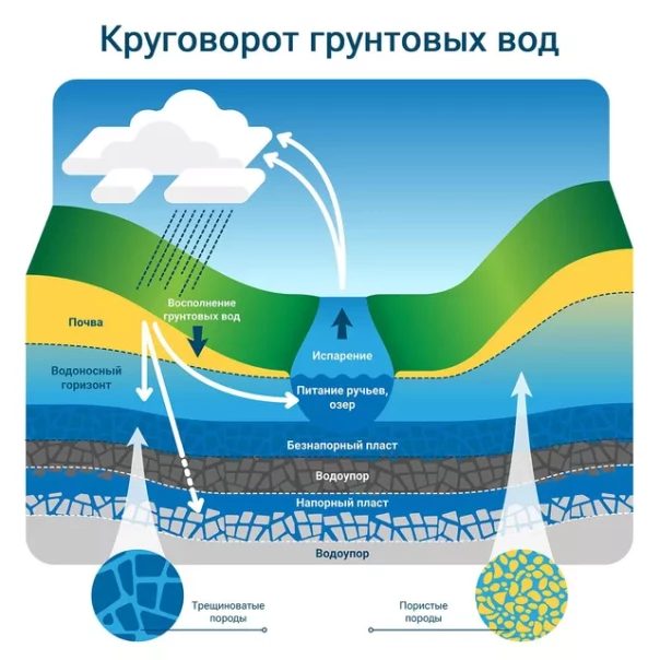 Грунтовые воды скапливаются в подземных горизонтах, сложенных проницаемыми горными породами, такими как песчаники, известняки. Они пополняются во время дождей, таяния снега и ледников. Их рассматривают как ископаемые запасы и добывают с помощью скважин.