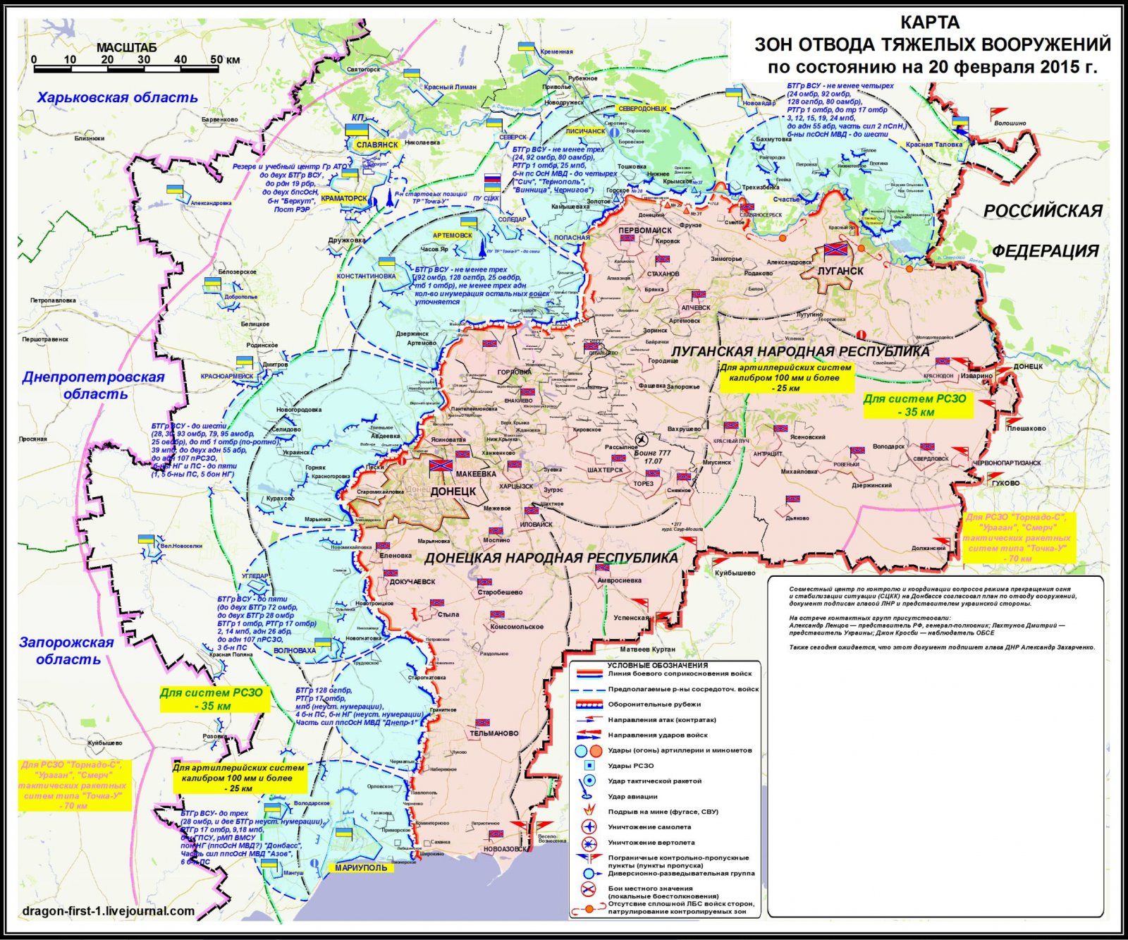 По состоянию на 23 февраля с позиций Донецкой и Луганской народных республик завершен отвод более 30 единиц тяжелого вооружения. С позиций армии ДНР осуществлен отвод около 20 единиц тяжелого вооружения, в том числе 6 реактивных систем залпового огня. Также досрочно были отведены артиллерийские системы крупных калибров и РСЗО из района Докучаевска, Горловки и Тельманово.
