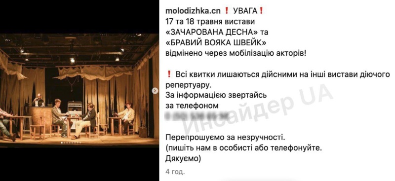 «17 и 18 мая спектакли „Зачарованная Десна‟ и „Бравый солдат Швейк‟ отменены из-за мобилизации актёров! Все билеты остаются действительными на другие представления действующего репертуара», — говорится на странице театра в соцсетях.