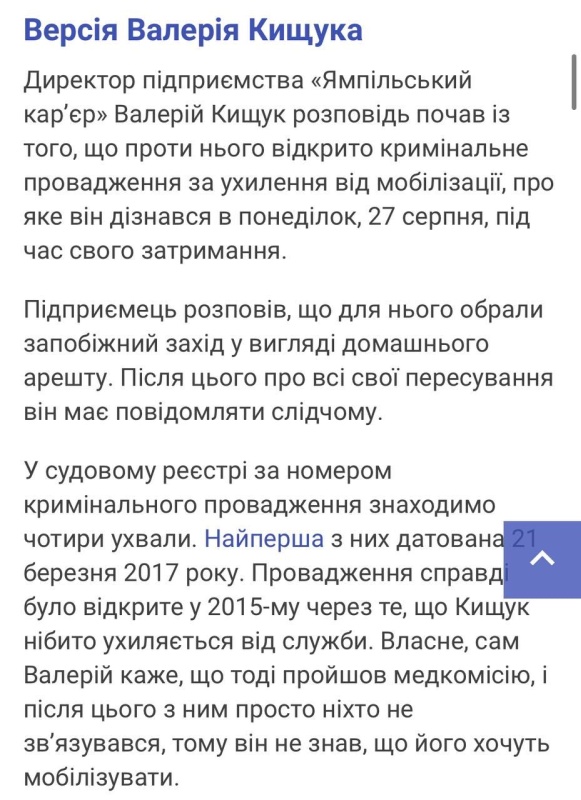 Украинские пабликах сообщают, что Кищук-старший принимал участие в силовой мобилизации. А в 2017 году на него открыли уголовное дело за уклонение от мобилизации, за что он был отправлен под домашний арест. Источник