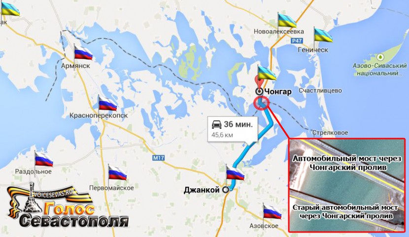 Украина заминировала мосты на границе с Крымом, сообщает «Интерфакс» со ссылкой на представителя пресс-службы пограничного управления ФСБ России по Республике Крым. По его словам, действующий мост на дороге между пограничными пропусками «Джанкой» (РФ) и «Чонгар» (Украина), а также старый мост, который сейчас не используется, были заминированы 17 февраля. Была зафиксирована закладка 42 деревянных ящиков зеленого цвета к опорам мостов. К ящикам подведены электрические провода, концы которых выведены в направлении места дислокации украинских военнослужащих.