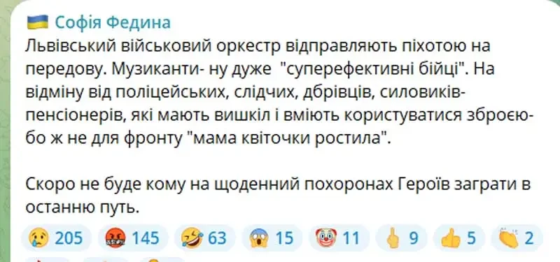 Музыканты – ну очень «суперэффективные бойцы». В отличие от полицейских, следователей, гбровцев, силовиков-пенсионеров, которые имеют обучение и умеют пользоваться оружием – ведь не для фронта «мама цветочки растила»– написала Федына.