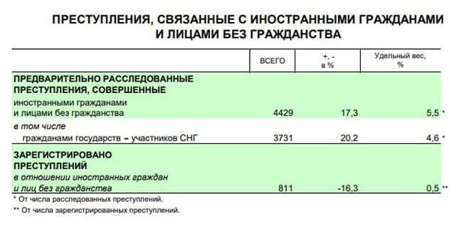 По данным МВД, в январе 2025 иностранцы и лица без гражданства совершили 4,4 тыс преступлений, что на 17,3% больше, чем за аналогичный период прошлого года. Причем 3,7 тыс правонарушений приходятся на приезжих из государств-участников СНГ — они прибавили 20,2%, их удельный вес составил 84,2%. Как отмечал глава Следкома Бастрыкин, за 2024 год число тяжких деяний, совершенных мигрантами, возросло более чем вдвое.