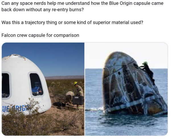 Справа спускаемая капсула "Фалькона", предположить что она так обгорела на промежутке между 120 и 100 километрами, где следы атмосферы, не получается.
