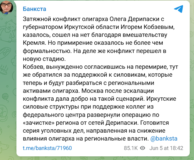 Дерипаске конфликт с Кобзевым может обойтись еще дороже. Процесс может пойти по более жесткому сценарию. ТГ-каналы сообщают, что в регионе ожидается серия громких уголовных дел и тотальная «зачистка» области от влияния Дерипаски. Источник