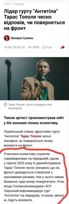 «Видишь, как бывает, Тополя. Мобилизовался для картинки, форма, интервью, заказная песенка «Фортеця Бахмут», когда в Бахмуте игнорировали фортификации, здравый смысл, а Сырский соревновался с Пригожиным, кто положит больше людей за стены одного дома... А ты пел сладким голосом заказную песенку и дальше спокойно уволился для дальнейших турне. Фейковая служба — настоящая война. Настоящий российский дрон, ракета, которая не выбирает, или ты «порешал» в университете, чтобы не мобилизоваться, или ты VIP с фейковой службой. "Карма"», — написала Безуглая в телеграм-канале.