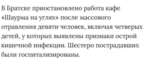 Словно злодей в плохом сериале, который клеит поддельные усы и продолжает творить зло, протухшая продукция продолжила реализовываться. Предписание закрыться? Не видели. Бизнес продолжился в лучших традициях: братчане снова могли играть в русскую рулетку с начинкой из шаурмы.