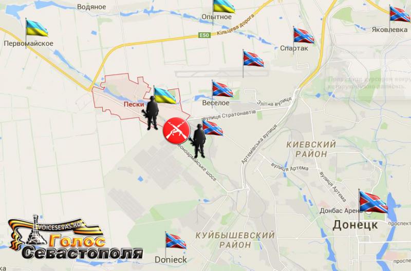 ВСУ в течение дня со стороны Песок из миномётов, ПТУРов и орудий БТР обстреливали позиции ополченцев в районе н.п. Весёлое, а также в Донецком аэропорте. По состоянию на 20:18 в районе Песок, ТЦ «Метро» и аэропорта были слышны перестрелки.