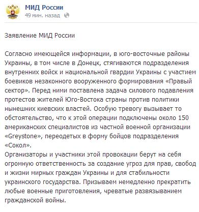 "Согласно имеющейся информации, в юго-восточные районы Украины, в том числе в Донецк, стягиваются подразделения внутренних войск и национальной гвардии Украины с участием боевиков незаконного вооруженного формирования Правый сектор. Особую тревогу вызывает то обстоятельство, что к этой операции подключены около 150 американских специалистов из частной военной организации Greystone, переодетых в форму бойцов подразделения Сокол, говорится в сообщении.