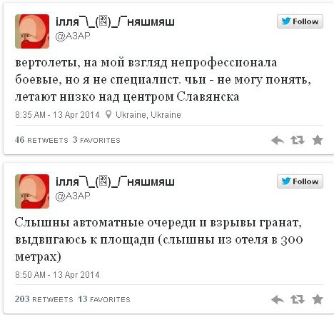 На сайте «Новостей Донбасса» есть информация о том. Что операция уже закончена, идет подсчет потерь. Ранее сообщалось, что к городу подъехала колонна из семи БТР, позже она разделилась. Огнем с одного из бронетранспортеров был ранен местный рыбак, одетый в камуфляжную одежду. По неподтвержденной информации в соцсетях сообщалось о трех погибших со тороны атакующих, а также о погибшем и двух раненых со стороны пророссийских активистов. Кроме того. местные жители сообщали о ух енных вертолетах, которые кружили над городом на очень низкой высоте. Участники форумов были убеждены. что у хунты нет достаточно резервов для долгой работы вертолетов и оказались правы — вертолеты покинули город спустя примерно час после начала.