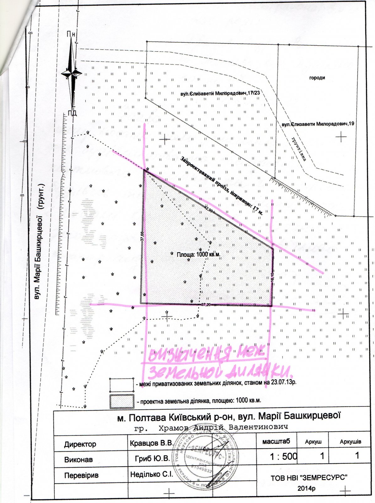 Обратите внимание, что координаты и границы земельного участка определены ООО НПИ “Земресурс” на ситуационной схеме, который, согласно генплану г.Полтава, расположен на территории усадебной застройки по улице Марии Башкерцевой в г. Полтава.