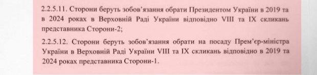 Стороны берут обязательства избрать президентом Украины в 2019 и 2024 годах в Верховной Раде представителя стороны 2 (члена блока Тимошенко - ред.).