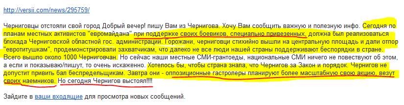 Добрый вечер! пишу Вам из Чернигова. Хочу Вам сообщить важную и полезную инфо. Сегодня по планам местных активистов "евромайдана" при поддержке своих боевиков, специально привезенных, должна был реализоваться блокада Черниговской областной гос. администрации. Горожани, черниговци стихийно вышли на центральную площадь и дали отпор "евротитушкам", продемонстрировали захватчикам, что далеко не все люди нашей страны поддерживают беспорядки в стране. Всего вышло около 1000 Черниговчан. Но сейчас наши местные СМИ-грантоеды, национальные СМИ ничего не повествуют об этом, а если и показываю / пишут, то очень искаженно. Хотелось бы, чтобы страна знала, что Чернигов за Закон и порядок. Чернигов не допустит привить бал беспредельщикам. Завтра они - оппозиционные гастролеры планируют более масштабную свою акцию, везут своих наемников. Но сегодня Чернигов выстоял!!!!