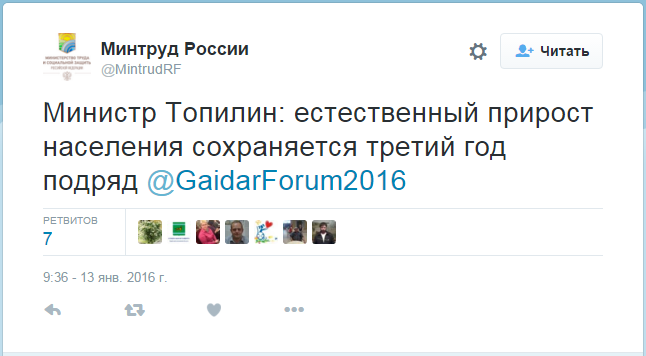 В ноябре Топилин заявлял, что рассчитывает на сохранение показателей естественного прироста населения по итогам 2015 года, как это было в 2013 и 2014 годах. Естественная убыль населения по итогам года фиксировалась в РФ в последний раз в 2012 году, составив 4,2 тысячи человек. Источник