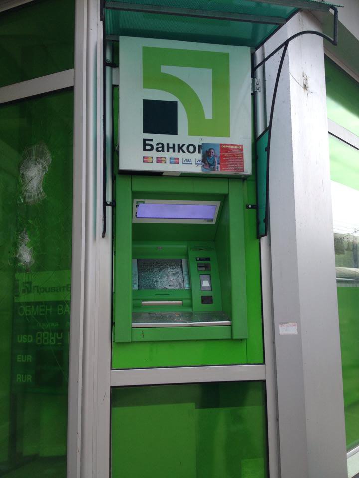 Неизвестные в ночь на 3 мая разбили стекла дверей и окон в нескольких отделениях "ПриватБанка" в районе Шахтерской площади, а так же изуродовали банкоматы при отделениях. Донецк, 3 мая 2014 года