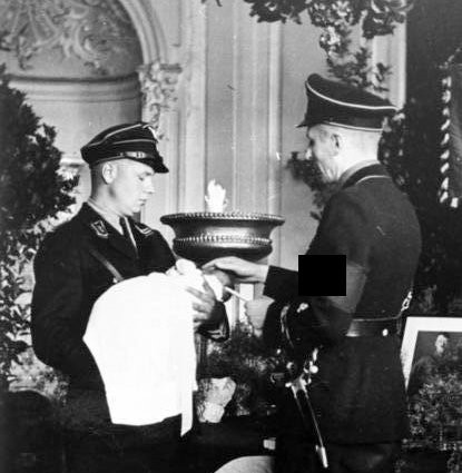 После этого под «тихие звуки немецкого национального гимна, написанного Гайдном», происходило само «имянаречение». Заведующий задавал матери вопрос: «Немецкая мать, обязуешься ли ты воспитывать своего ребенка в духе национал-социалистического мировоззрения?» После утвердительного ответа, как на свадьбе, наступала очередь отца или крестного. Его спрашивали: «Готов ли ты наблюдать за воспитанием этого ребенка в духе родовой общности охранных отрядов?» Эсэсовец должен был дать утвердительный ответ и пожать протянутую руку заведующего.