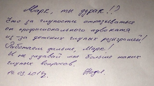 «Марк, ты дурак!?» Что за глупости отказываться от профисионального адвоката из-за детских глупых розыгрышей? Работаем дальше, Марк! И не задавай мне больше таких глупых вопросов», – ответила Савченко. Источник