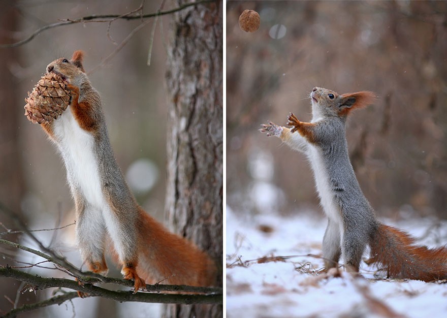 Фотограф из России Вадим Трунов имел опыт встречи с белками и раньше, но фотографии белок, которые фотографируют сами себя, лепят снеговиков и играют в волейбол - это нечто.