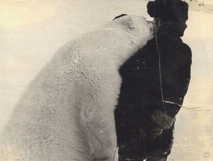 СССР, Крайний Север, 80-е годы. Полярники подкармливают голодную медведицу сгущенкой. Она лапой выдавливала молоко, съедала, а потом уже кормила медвежат.