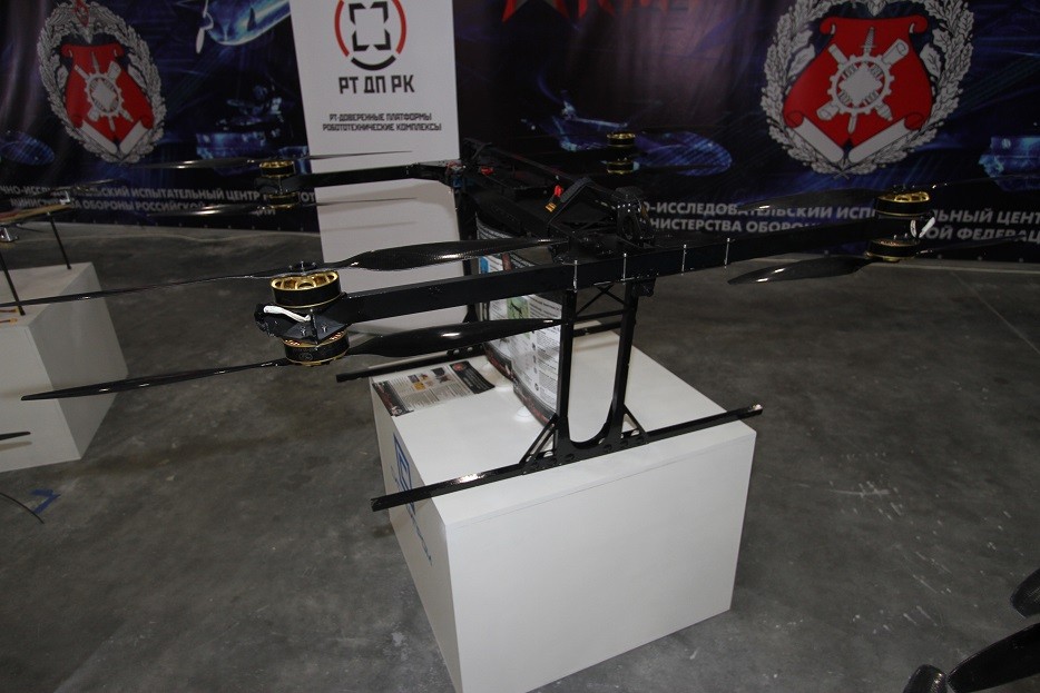 На стенде «дочки» ГК «Ростех» компании «РТ – Доверенные платформы и робототехнические комплексы» («РТ ДП РК», Москва) был показан ряд беспилотных летательных аппаратов вертолетного типа мультироторной схемы, в том числе достаточно крупный восьмивинтовой аппарат, способный транспортировать различные грузы. Кубинка, 23.03.2017 (с) Денис Федутинов