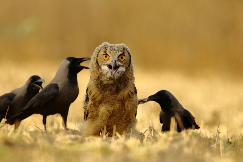 «Я высматривал леопардов в округе Сирохи, Раджастан. Но вдруг услышал вороний крик и увидел, что они вьются над небольшим участком. Из-за кустарников я не мог выяснить причину оживления птиц и медленно пополз в их сторону. Я был шокирован, увидев, что группа ворон напала на юного индийского филина», – фотограф Дирадж Мали (Dheeraj Mali).
