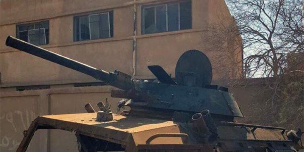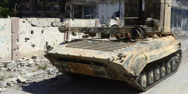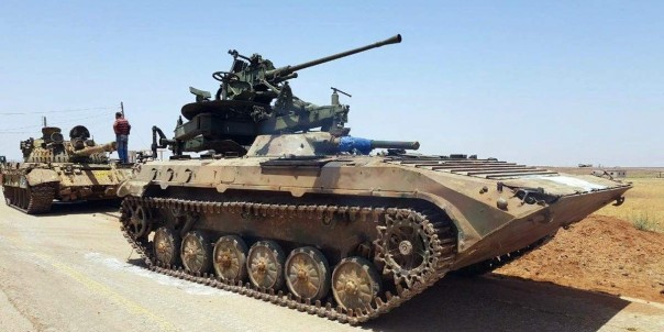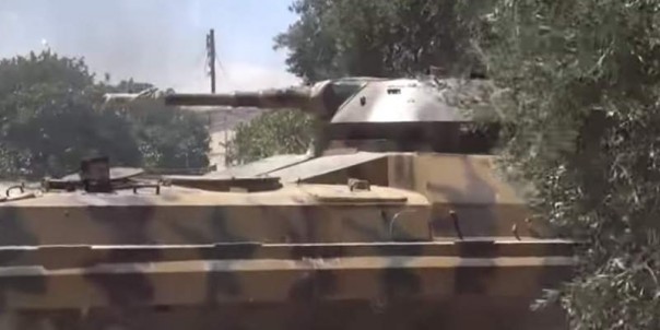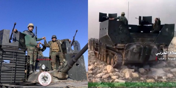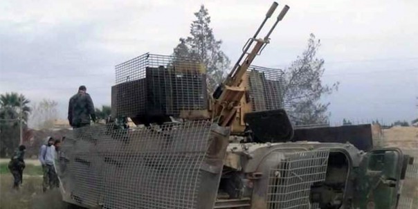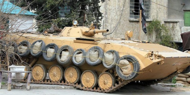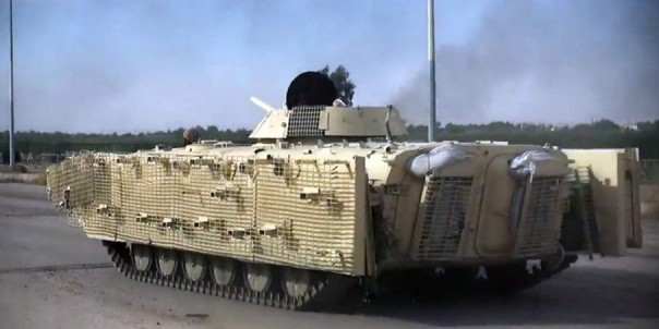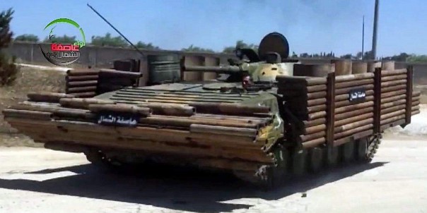 Сирийцы нуждаются в технике, потому всё идёт в дело. Эта БМП-1 стала базой для ракетной установки с блоком из пяти направляющих для 300-мм ракет «Вулкан», напоминающих по форме «Луку Мудищева» М-31 времён Великой Отечественной.