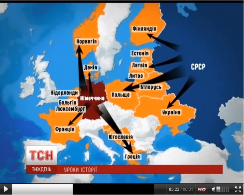 Кроме этого в сюжете о событиях 1941 года используется карта, где Украина якобы никак не соотносится с СССР. Венчает беспрецедентное нагромождение подлости, лжи и маразма Крым в составе "отдельной" от СССР Украины, который даже тогда был российским.