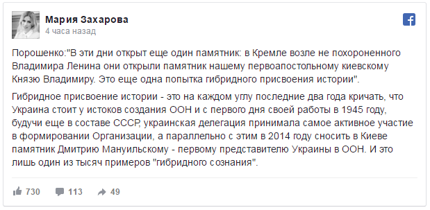 Гибридное присвоение истории — это на каждом углу последние два года кричать, что Украина стоит у истоков создания ООН и с первого дня своей работы в 1945 году, будучи ещё в составе СССР, украинская делегация принимала самое активное участие в формировании организации, а параллельно с этим в 2014 году сносить в Киеве памятник Дмитрию Мануильскому — первому представителю Украины в ООН. И это лишь один из тысяч примеров «гибридного сознания», — написала Захарова на своей страничке в Facebook.