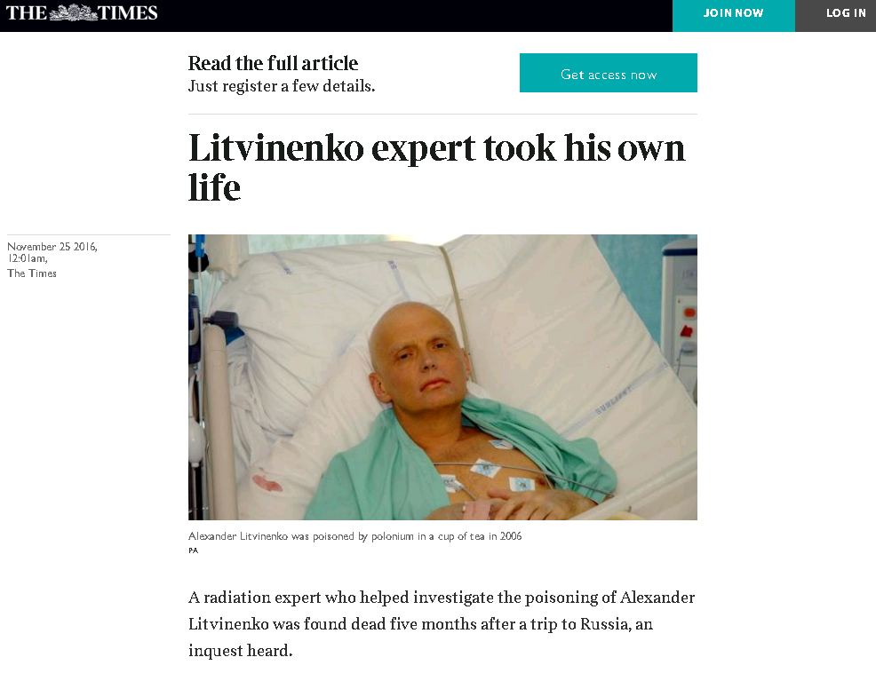 В Великобритании покончил с собой эксперт по радиации Мэтью Панчер, участвовавший в расследовании гибели бывшего подполковника ФСБ Александра Литвиненко, сообщают СМИ со ссылкой на The Times.