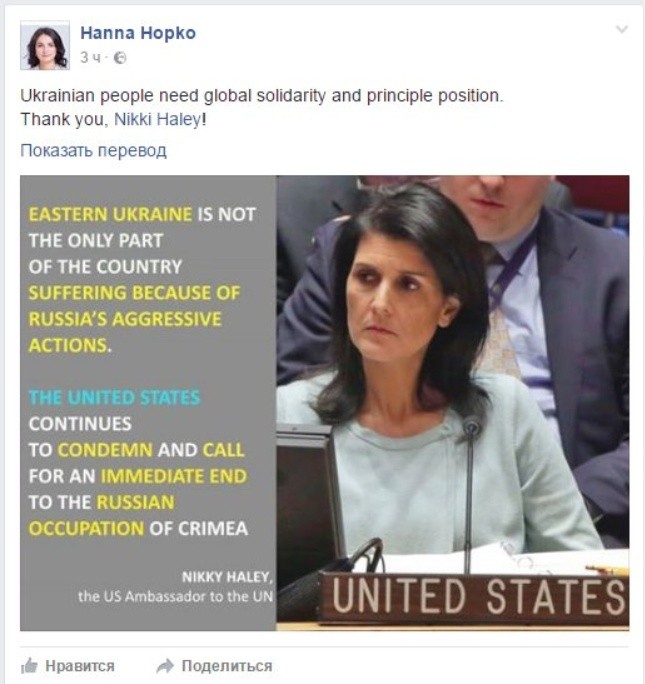 «США стоят вместе с народом Украины, который более трех лет страдает от оккупации и военной интервенции России», — отметила Хейли.